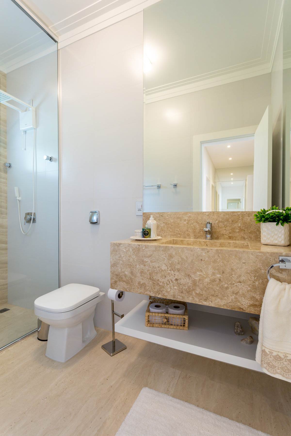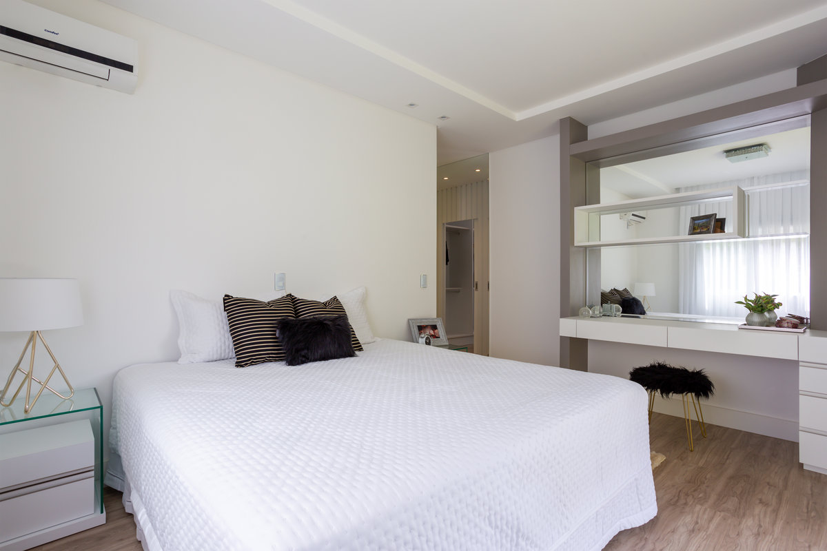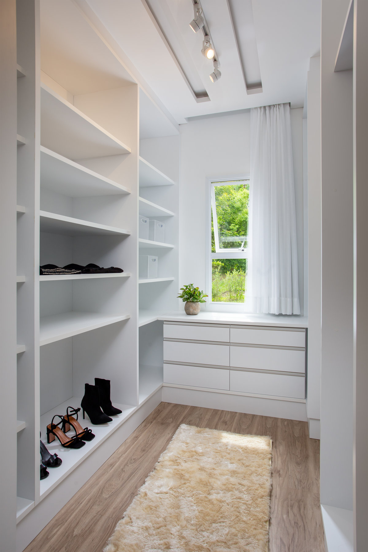 Nada de exageros; aqui esse casal queria leveza e paz de espírito, que foram traduzidas em uma marcenaria com cores minimalistas e que parecem flutuar com suas formas suspensas e tonalidades claras.