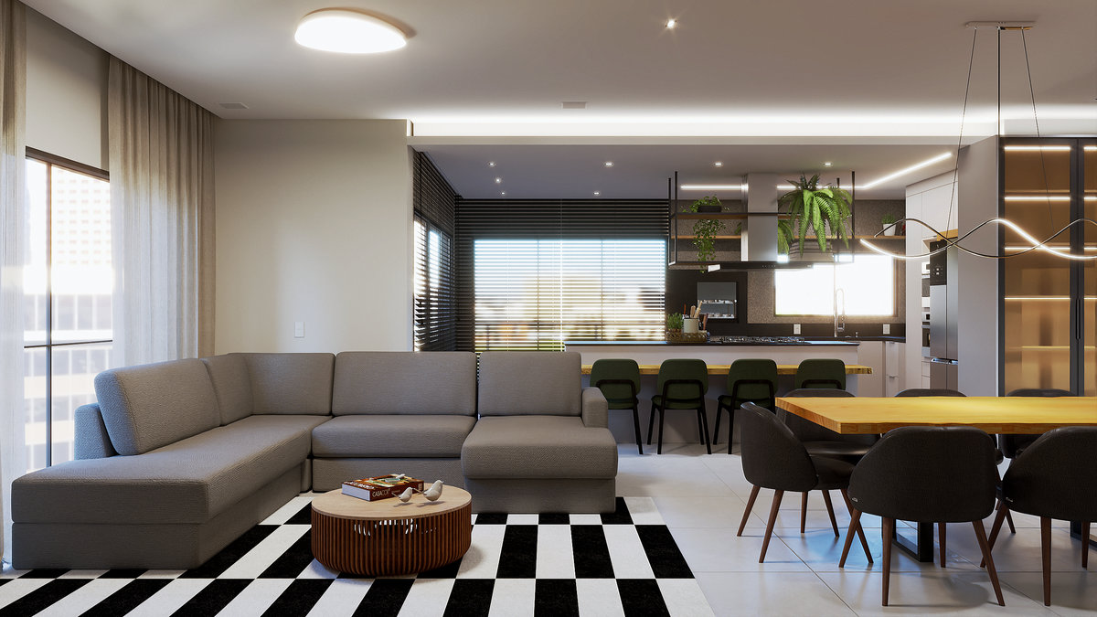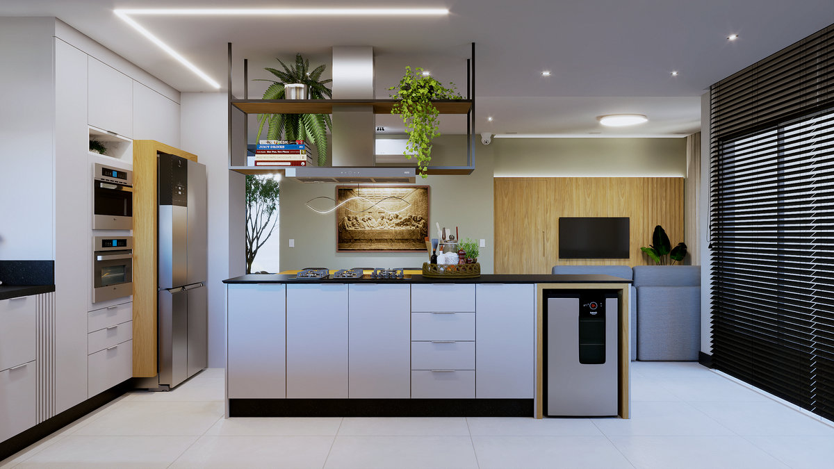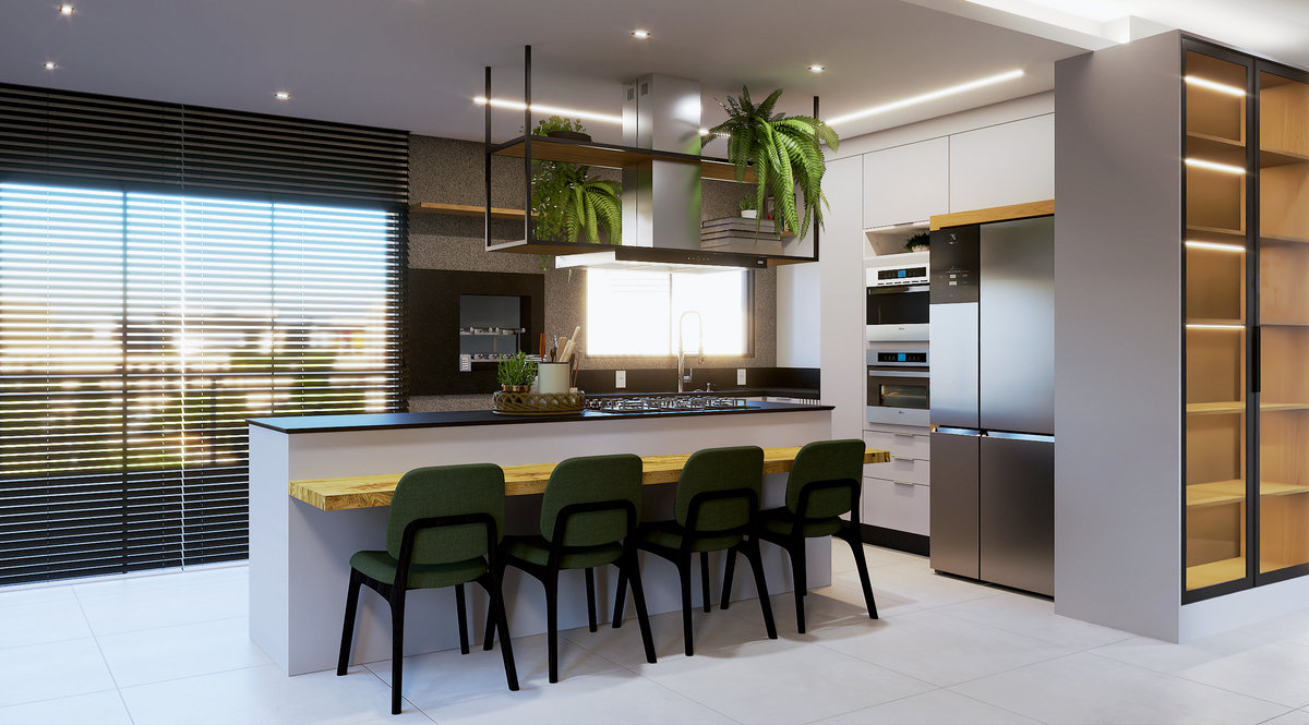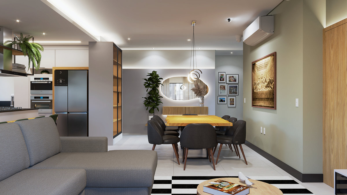 Horizonte é mais que um projeto — é a tradução da vida prática com charme contemporâneo. Entre luz natural, tons neutros e o frescor do verde, este lar integra cozinha, jantar e estar com fluidez, criando um espaço funcional e ao mesmo tempo convidativo para o dia a dia da família.