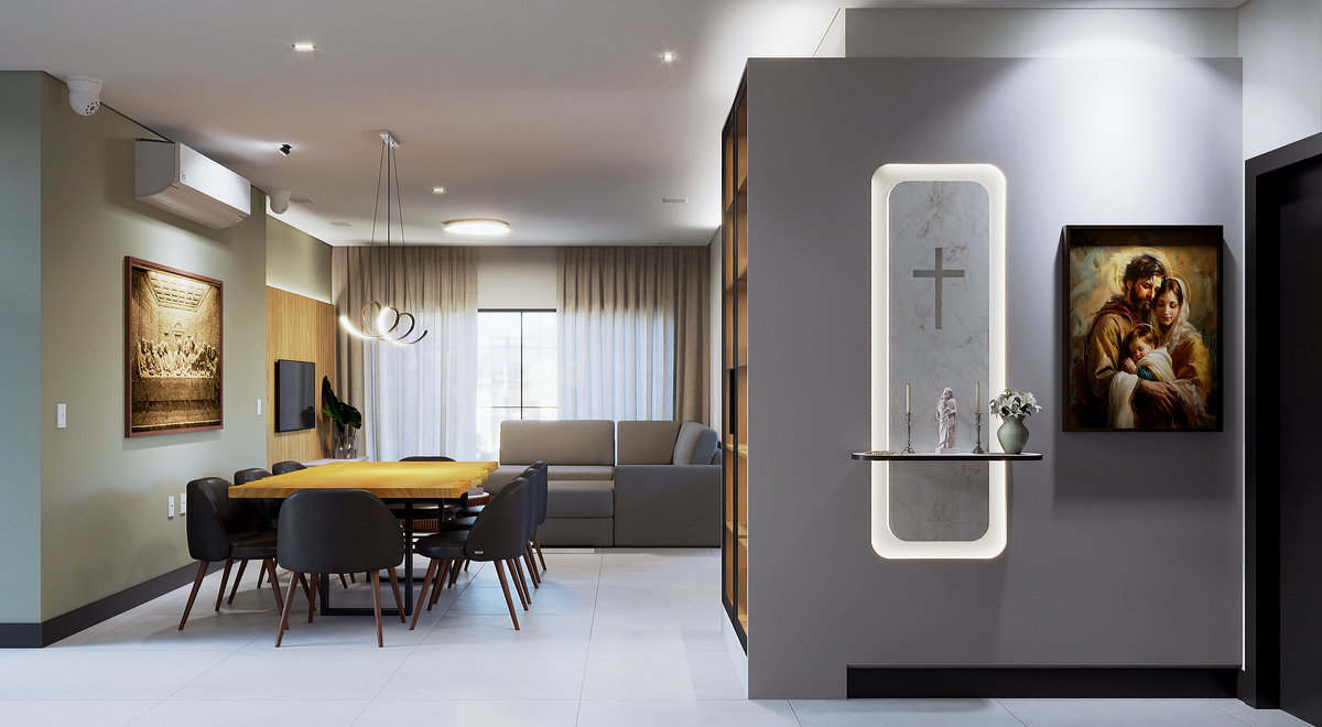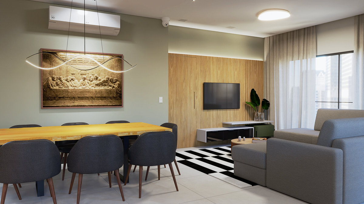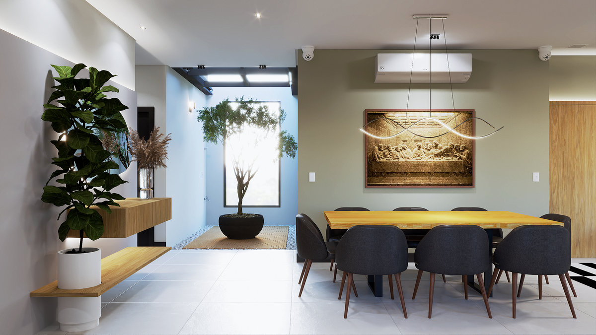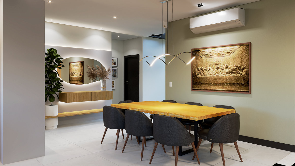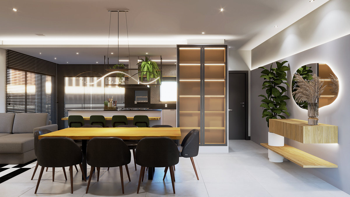 Horizonte é mais que um projeto — é a tradução da vida prática com charme contemporâneo. Entre luz natural, tons neutros e o frescor do verde, este lar integra cozinha, jantar e estar com fluidez, criando um espaço funcional e ao mesmo tempo convidativo para o dia a dia da família.
