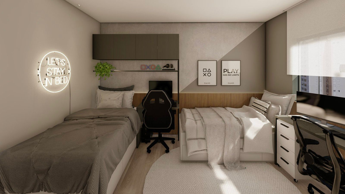 O desafio de trazer a sensação de amplitude para pequenos espaços faz com que possamos mostrar o poder de uma boa arquitetura. O MT Gamer é um dormitório pequeno, projetado para dois irmãos. Com a premissa de ter – como o nome já diz – espaço para computadores, a disposição dos móveis foi estrategicamente pensada para maior aproveitamento de armazenamento, sem carregar o ambiente com paredes fechadas de armários. Aqui funcionalidade era essencial. O conforto, também!